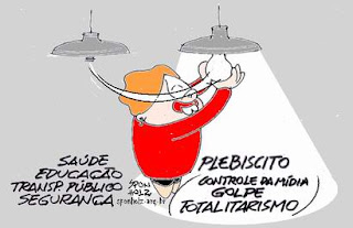 Agora, que os passageiros se amotinaram, a "comandanta" diz quer dialogar com a sociedade e que vai ouvir a voz das ruas. Mas de imediato, convida para o "diálogo" um grupelho minoritário, que não representa a sociedade e que se identifica com o partido que está no poder! Sim, o Movimento Passe Livre está ideologicamente afinado com uma ala do PT e é financeiramente suportado pelo governo. Que diálogo é esse? Diálogo seria convocar o Conselho Federal de Medicina para discutir de imediato saídas emergenciais e depois as definitivas para a questão da Saúde. Diálogo seria convocar as lideranças do Congresso, inclusive as da oposição, junto com OAB e outras organizações da sociedade, para discutir soluções para o impasse político. Ouvir a voz das ruas seria extinguir dois terços desse ministério inútil e substituir os demais ministros por gente competente não importando a qual partido pertençam. Ouvir a voz das ruas seria apoiar veementemente a prisão sem delongas dos mensaleiros condenados. Ouvir a voz das ruas seria mandar apurar até o final o caso Rosemary, mesmo que isso envolva o seu chefe e patrão. Aliás, cadê ele? Doutor honoris causa em protestos e manifestações populares, nessa hora, ao invés de ajudar o governo na saída da crise, ele se esconde.